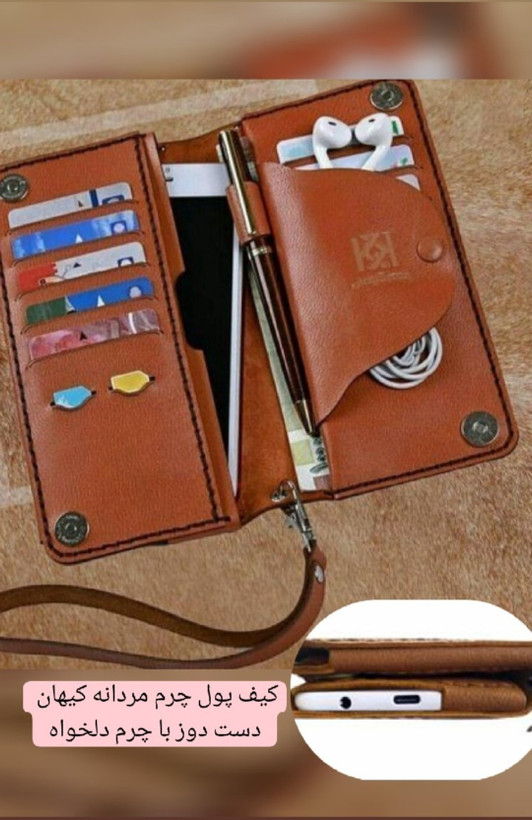 نحوه کاربرد: کیف پول همه کاره اعم از جای گوشی، جای کارت، پول و مدارک شناسایی و غیره لازم به توضیح است بنا به درخواست مشتری میتوان جای خودکار ، جای سیم کارت و جای هندزفری نیز در نظر گرفته شود.
